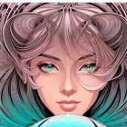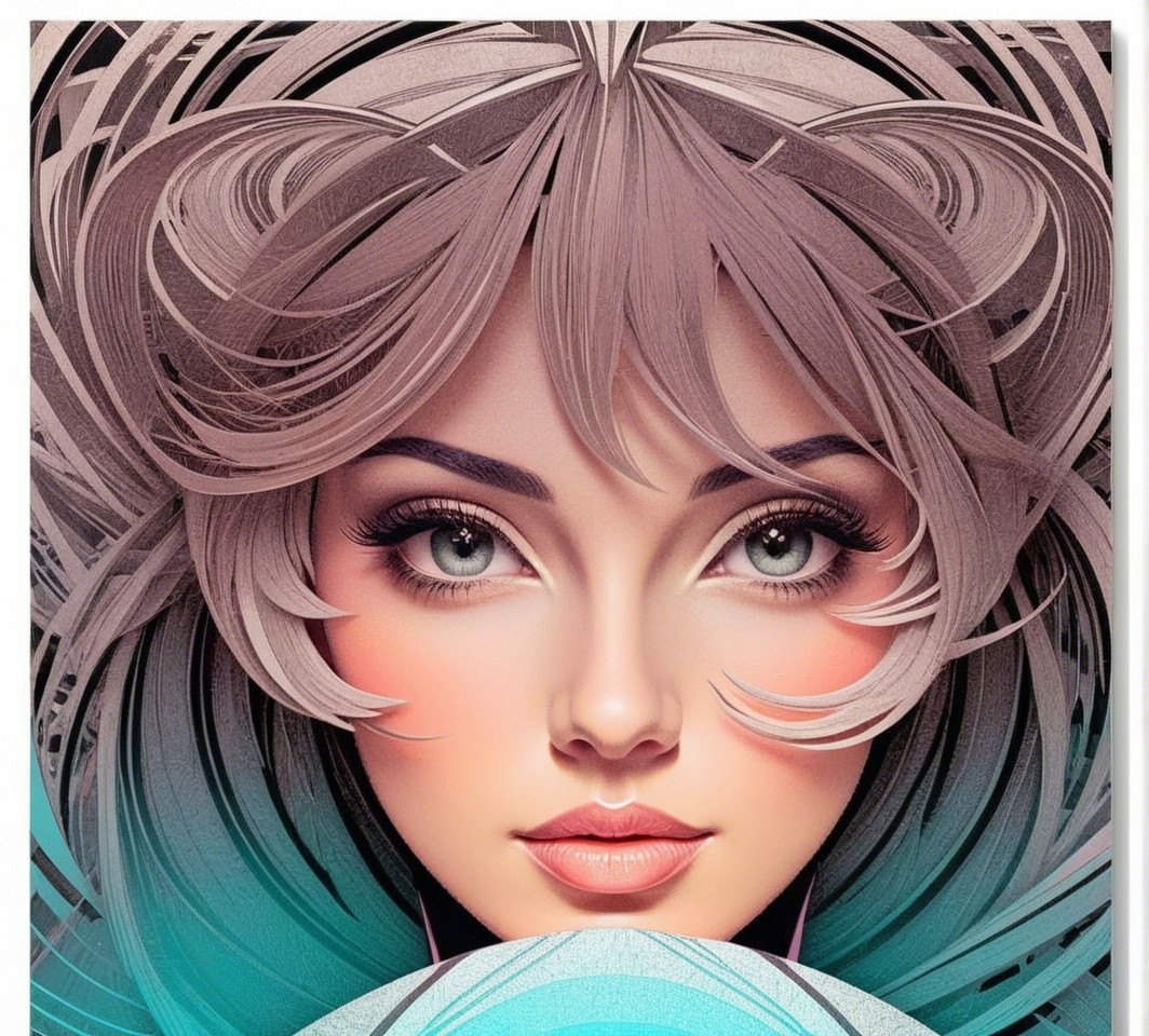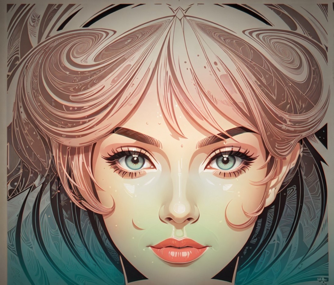 + Prompt:Line-art, style of Darren Waterston, stylized female portrait, retrofuturistic collagraphy print, geometrical linocut style, gradient coloring, contigous abstracted line-art, warped, catenaries, vortexes, swirls, fractals, only curves, perpendicular streamline_moderne, 3d effects, raytraced shadows, texture mapping, shadow mapping, displacement mapping, concept art by Buckminster Fuller and Stand Lee, harsh, gradient coloring, overlay, layered vector art, folk-art, ambitious Shipibo-Conibo patterns merged with zentangle linework, female headshot in style of Felix Colgrave and Frank Miller and Man Ray, line-art, comic book art, cel-shaded, unique, liminal, very relaxed, generative patterns with soft edges, only curves and bended linework, subtle visble watercolor textures, warm tones, high coloring, parallax occlusion 1.5. hues by William Bradley, subsurface scattering 1.2, quaintly contoured, warm purple tones, cubistic-inspired background, catenaries, organic textures by Dan Mumford and Frank Frazetta, supernatural asymmetry, unsettling, painterly effects, visible porcelain skin texture, displacement mapping, plasmatic hatchings, scratched edges, cel-shaded lighting is soft and diffused delicate linework features and textures. The cartoon-style composition is symmetrical, with a focus on the face and hair, creating a sense of harmony and mystery. Henri de Toulouse-Lautrec influence, Bloom-Effect, interpolated, serene expressionism by Ed Binkley, diffused reflections, mip-mapping, displacement mapping, parallax occlusion, quaint, enlarged shadows, soft rain falling. Golden hour atmosphere, delicate luminous coloring, whimsical swirling patterns. Plasticity 1.7, harmoniously sculpted features, illusion of flowing hair, amidst ethereal layers of fabric merging with turbulent flares, liminal, luminism 1.6, plasticity 1.9, dynamic lighting effects and ambient occlusion by Ho Baron, lighting of Ed Paschke, brightened colors, impossible light transitions, luminism, futuristic, abstracted, figurative, layered, unique texture mapping 1.8, detoriated background, retrofuturism, fallout video game movie still, simplistic coloring scheme, sassy hues by Lawrence Schwinger, displacement mapping 1.6,