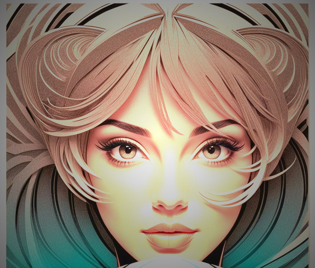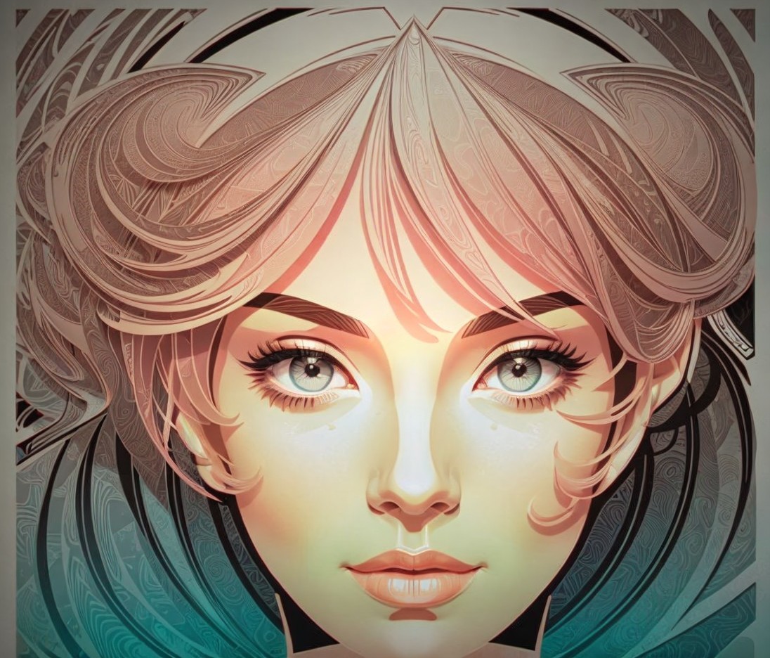 Prompt: Line-art, style of Darren Waterston, stylized female portrait, retrofuturistic collagraphy print, geometrical linocut style, gradient coloring, emulsion, oily paint, brightness 1.3, linework, micro-pen lines, zentangle effect, curves, catenaries, fractals, contigous abstracted line-art, warped, catenaries, vortexes, swirls, fractals, only curves, perpendicular streamline_moderne, 3d effects, raytraced shadows, texture mapping, shadow mapping, displacement mapping, concept art by Buckminster Fuller and Stand Lee, harsh, gradient coloring, overlay, layered vector art, folk-art, ambitious Shipibo-Conibo patterns merged with curvaceous linework, female headshot in style of Felix Colgrave and Frank Miller and Man Ray, line-art, comic book art, cel-shaded, unique, liminal, very relaxed, generative patterns with soft edges, only curves and bended linework, subtle visble watercolor textures, warm tones, high coloring, parallax occlusion 1.5. hues by William Bradley, subsurface scattering 1.2, quaintly contoured, warm purple tones, cubistic-inspired background, catenaries, organic textures by Dan Mumford and Frank Frazetta, supernatural asymmetry, unsettling, painterly effects, visible porcelain skin texture, displacement mapping, plasmatic hatchings, scratched edges, cel-shaded lighting is soft and diffused delicate linework features and textures. The cartoon-style composition is symmetrical, with a focus on the face and hair, creating a sense of harmony and mystery. Henri de Toulouse-Lautrec influence, Bloom-Effect, interpolated, serene expressionism by Ed Binkley, diffused reflections, mip-mapping, displacement mapping, parallax occlusion. Golden hour atmosphere, delicate luminous coloring, whimsical swirling patterns. Plasticity 1.7, harmoniously sculpted features, illusion of flowing hair, amidst ethereal layers of fabric merging with turbulent flares, liminal, luminism 1.6, plasticity 1.9, dynamic lighting effects and ambient occlusion by Ho Baron, lighting of Ed Paschke, brightened colors, impossible light transitions, luminism, futuristic, abstracted, figurative, layered, unique texture mapping 1.8, detoriated background, retrofuturism, fallout video game movie still, simplistic coloring scheme, sassy hues by Lawrence Schwinger, displacement mapping 1.6,