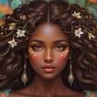 A woman with deep, curly hair adorned with flowers and leaves gazes softly. Bright earrings and floral elements surround her, creating a vibrant, enchanting atmosphere.