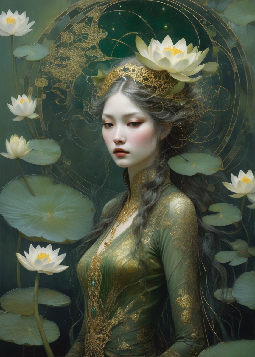 Ethereal Mysterious Divine Lady, art by Amy Judd, Yoann Lossel, Stephanie Law, Frances MacDonald, Michael Hussar, Hans Makart, caia Koopman, Daniel Merriam. Background by Bill Jacklin, beautiful face, delicate green and gold lace Gilded dress, illuminated by Moonlight, inlay water lilies intertwined with her hair, art deco, shimmer, glow, upper body shoot, cold tones, polished finish, highly detailed
