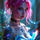 A fantastical portrait of a figure adorned with vibrant, flowing hair in shades of pink and blue, surrounded by ethereal, colorful feather-like elements, exuding a magical and otherworldly aura.