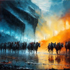 A surreal landscape features towering, jagged formations shrouded in mist, with a striking contrast of vibrant oranges and deep blues, evoking an ethereal and otherworldly ambiance.