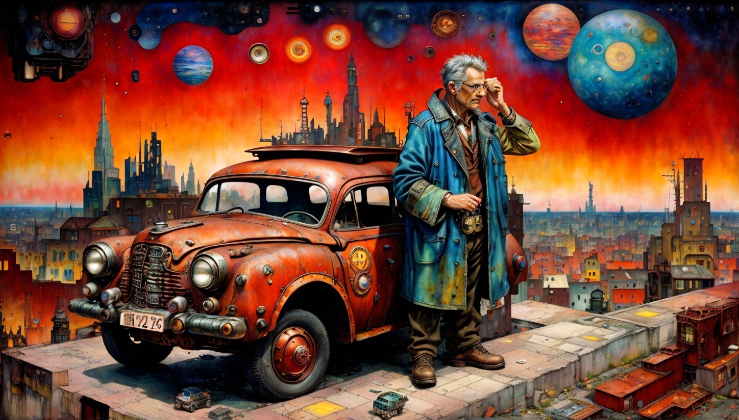 Prompt: Old man with rusted cars, futuristic steampunk cityscape, cyberpunk details, red photorealistic cosmic sky, by Dave McKean, Egon Schiele and Gustav Klimt, mixed media, miniature