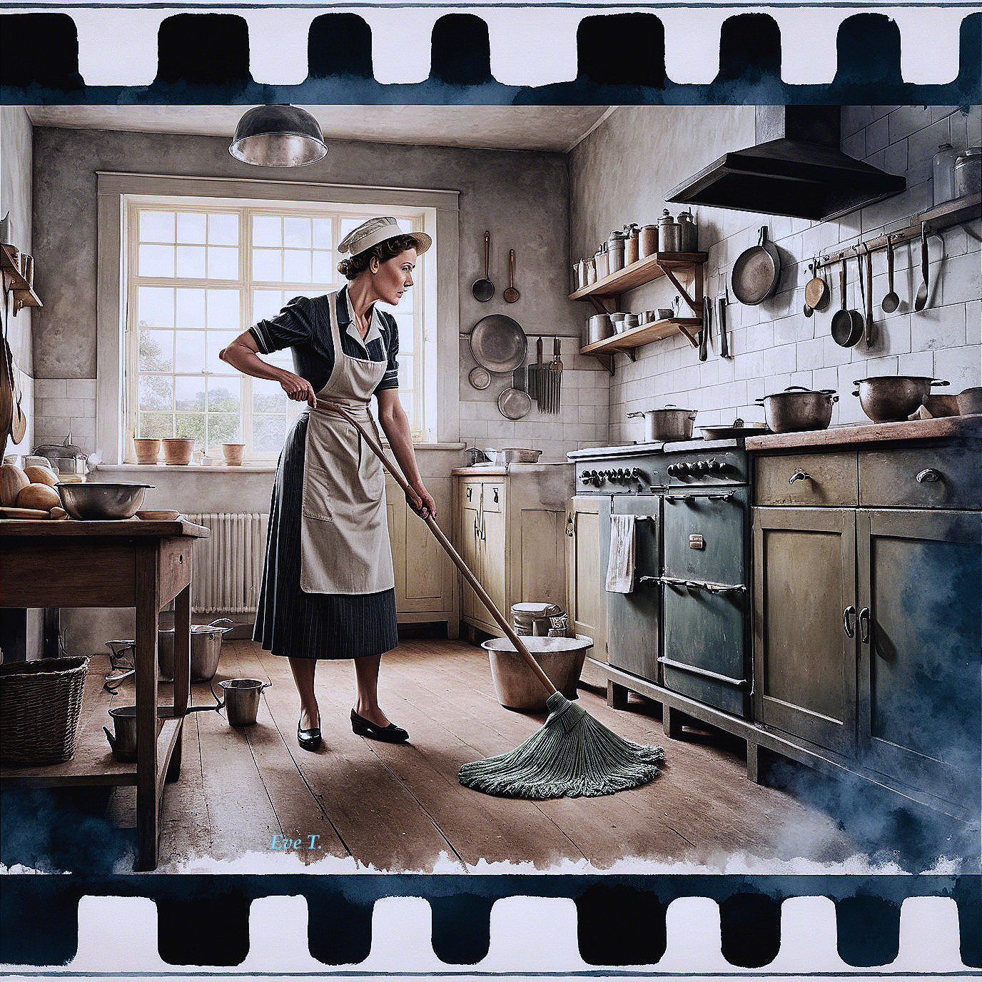 A woman in vintage attire mops away the evidence filled with pots and wooden shelves. Sunlight streams through a window, illuminating the atmosphere, of crime and passion, (possibly).