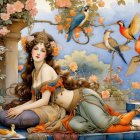 A serene woman reclines in a lush garden, adorned in an elegant dress. Vibrant birds flutter around her, while orange fruits hang above, creating a tranquil, enchanting atmosphere.