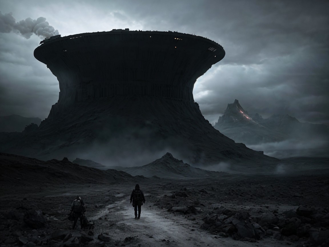 Prompt: "Desolate landscape, white humanoid silhouettes, post-apocalyptic setting, unsettling mountain structure, billowing smoke, child and adult figures, themes of isolation, vulnerability, conformity, loss of individuality, ominous and oppressive ambiance, dystopian vision, technological influence, societal impact, dehumanization concept, digital artwork, surreal and detailed execution, dark color scheme, dramatic lighting effects, thought-provoking narrative, by Simon Stålenhag, Artstation."