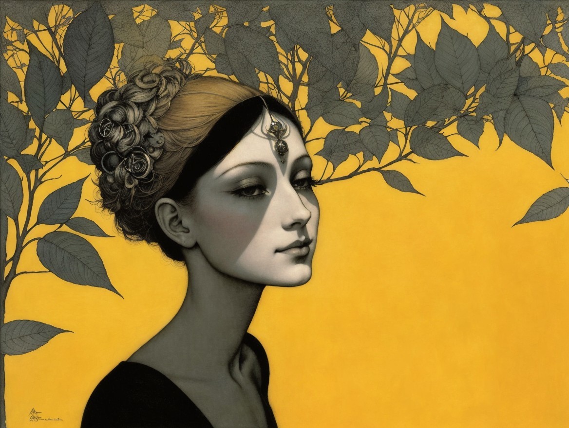 A serene portrait of a young woman with a delicate updo, adorned with pearls and framed by geometric shapes against a vibrant yellow background, conveying elegance and grace.