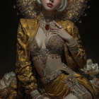 The image features a young woman with extravagant, voluminous blonde hair, dressed in a metallic gold outfit. Her accessories and the starry background create a futuristic, glamorous look.