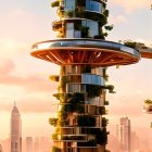 A futuristic skyscraper spirals upward, featuring lush greenery, terraces, and innovative design against a vibrant sunset. Nearby, sleek city towers rise, blending nature with modern architecture.