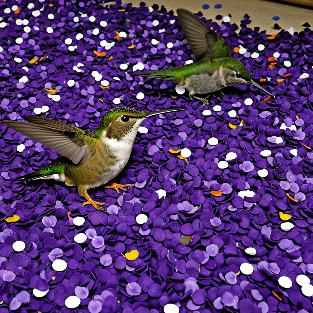 Two hummingbirds hover over a purple surface scattered with multicolored candies.