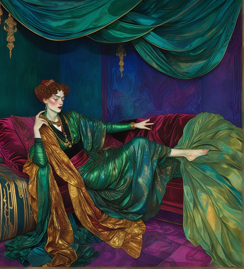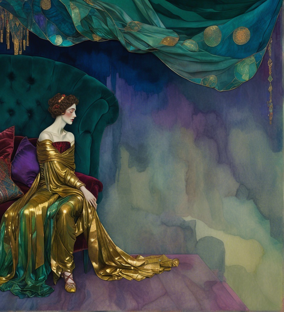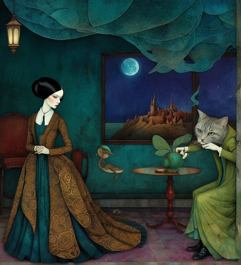 The artwork depicts three elegantly dressed figures under a moonlit sky, with glowing lanterns illuminating the scene. The central figure holds an umbrella, creating a serene, mystical atmosphere.