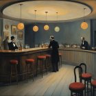 A serene, elegantly designed room features two women: one near a desk, the other gazing out at a coastal scene. Soft lighting and a moonlit view create a tranquil atmosphere.