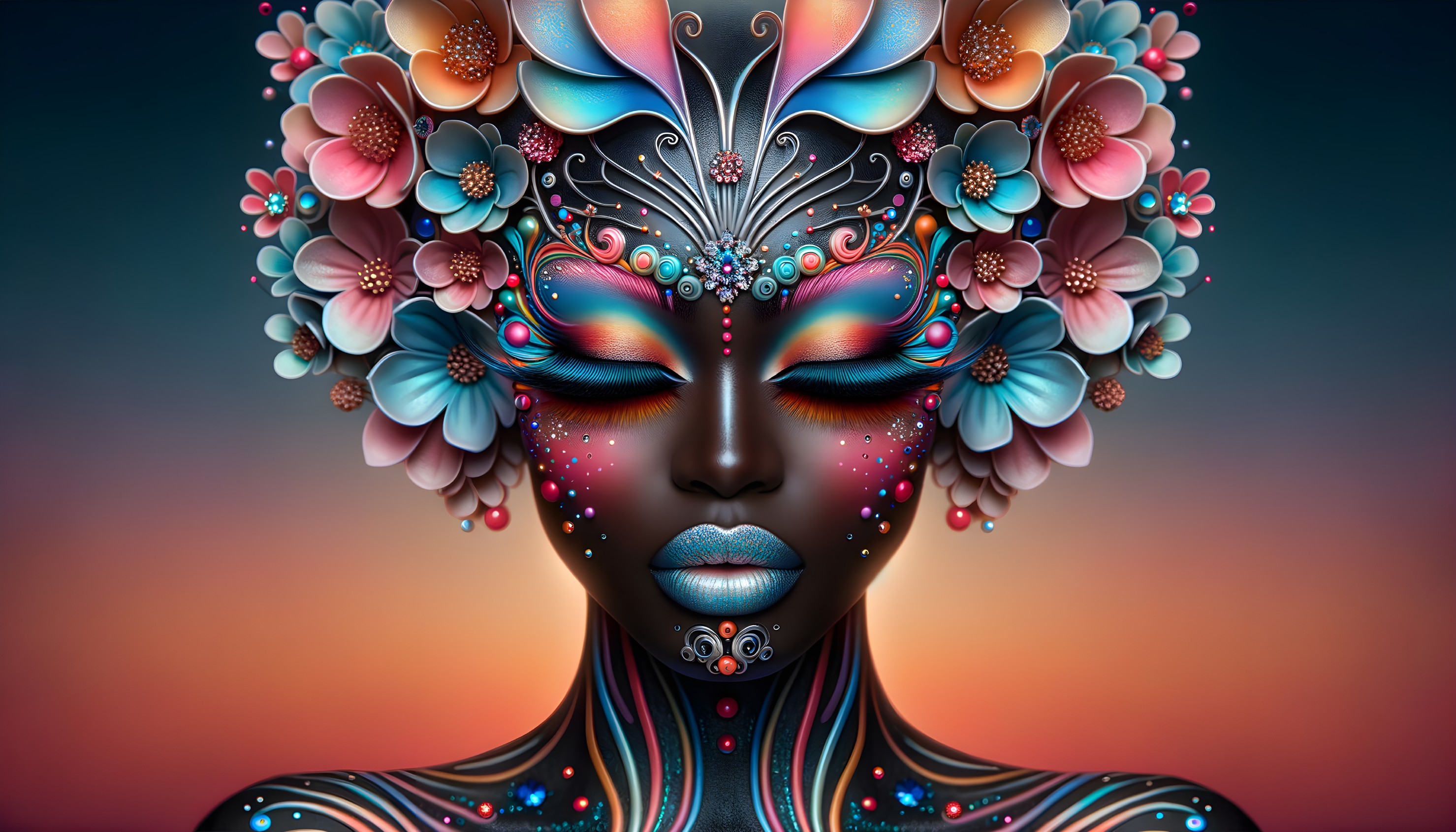A vibrant and intricate fantasy makeup look featuring a female subject with butterfly-inspired patterns in shades of pink, blue, orange, and yellow. The elaborate design includes bold eyeshadow, metallic blue lipstick, and a floral headpiece, set against a gradient background transitioning from warm orange to soft pink.
