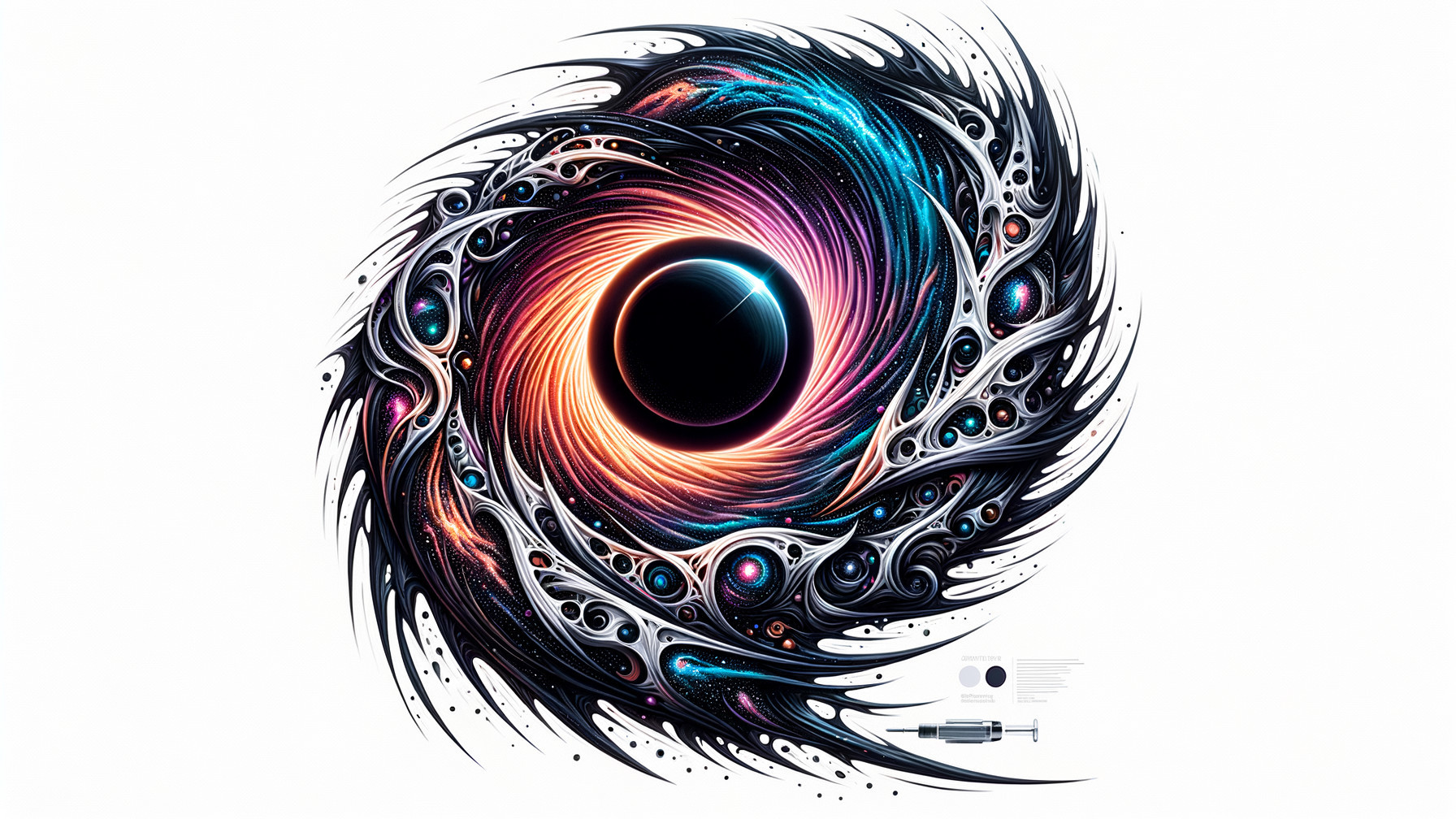 The image features an abstract depiction of a black hole, surrounded by swirling cosmic patterns. Vibrant colors like purple, blue, and orange represent galaxies and stars, creating a mesmerizing effect.