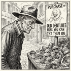 Prompt: black and white ink of a old man in a hat looking down at a stall, next to a sign with a cartoon drawing of a smiling, balding man. PURCHASE OF OLD DENTURES HERE YOU CAN TRY THEM ON