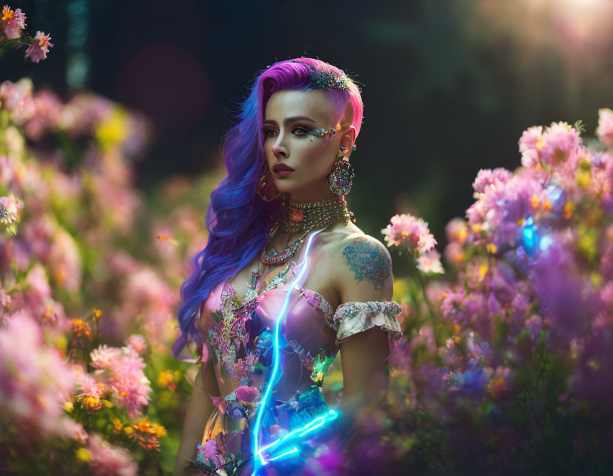Prompt: A beautiful space explorer woman walks through a colourful alien landscape on a distant planet. The side of her head buzzed and hair dyed blue. The rest of her head has long flowing pink and purple hair. Strange colourful plants surround her, giant pink and blue flowers, the field disappears into the horizon with mountains in the distance and a cosmic milky way sky filled with nebula clouds above.