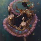 A surreal artwork depicting four ethereal figures adorned with intricate gold patterns, flowing fabrics, and vibrant colors, surrounded by a dreamy, swirling background.