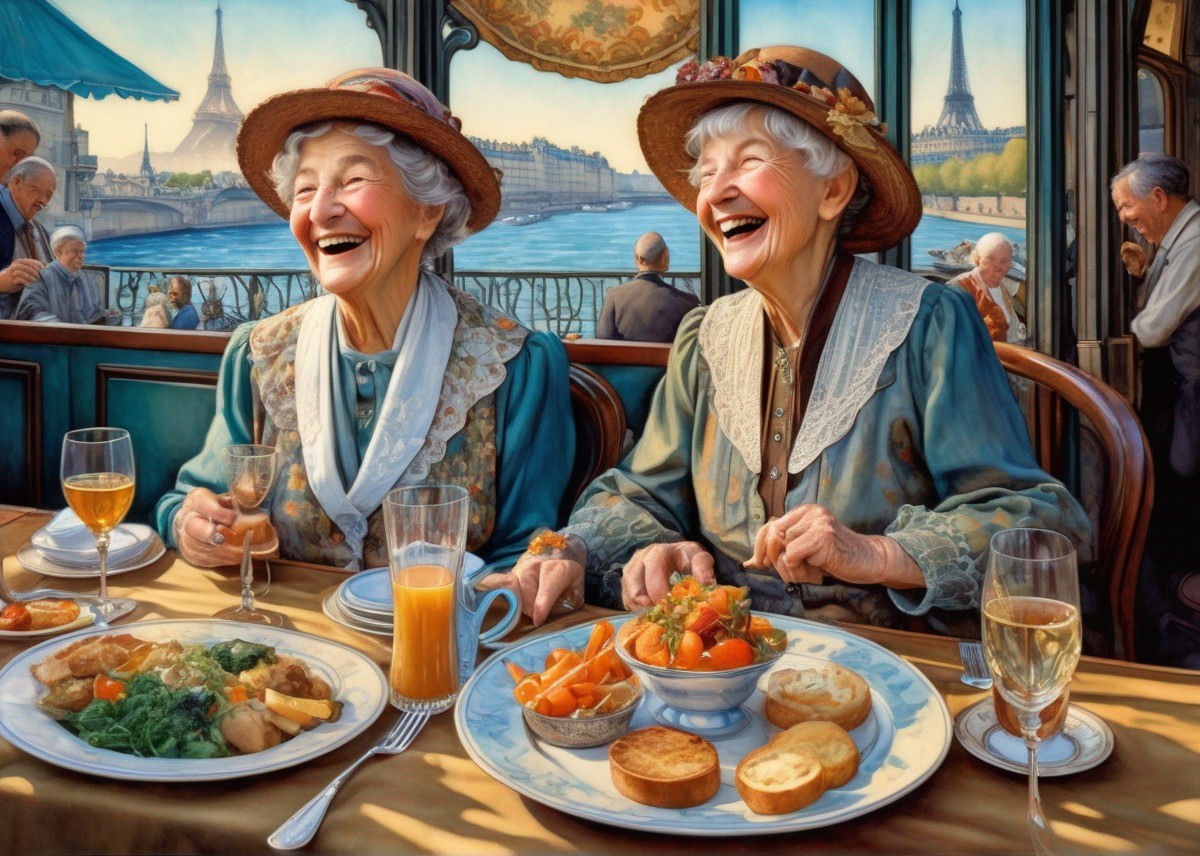 Two elderly women laugh joyously at a table with food and drinks, with a scenic city backdrop visible from a window.