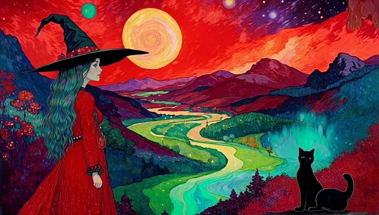 + Prompt:highland landscape in mountains, witch with black hat and black cat, green stream, red and purple glorious sunset over lake, burning fire and red sun, Conquest of Paradise, cosmic sky, nice waterfalls and a beautiful tree and path, bridge over river, some flower details by Gustav Klimt , elegant fantasy, intricate beautiful wallpaper colourful, Van Gogh