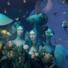 The image features ethereal figures adorned with nature-inspired elements, blending human and animal forms. They are surrounded by vibrant flowers and whimsical creatures, creating a dreamlike atmosphere.