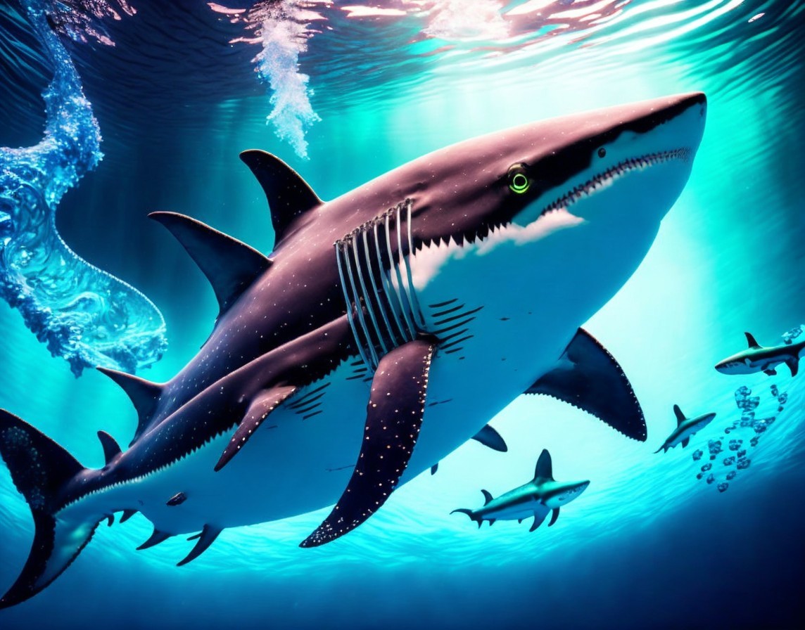 Large Shark with body covered in carved runes, glowing green eyes in the ocean, glowing orange tattoos and runes on the underbelly of the shark, below is twisted purple and neon green coral and seaweed