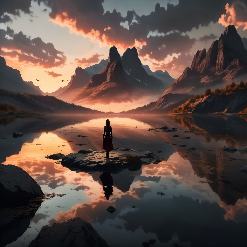 A person stands on a rock amidst a tranquil lake at sunset, with majestic mountains in the background and a sky ablaze with colors.