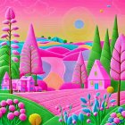 A vibrant, surreal landscape featuring pink trees, a flowing wave, and lush vegetation under a colorful sky. The scene is infused with whimsical colors, creating a dreamy atmosphere.