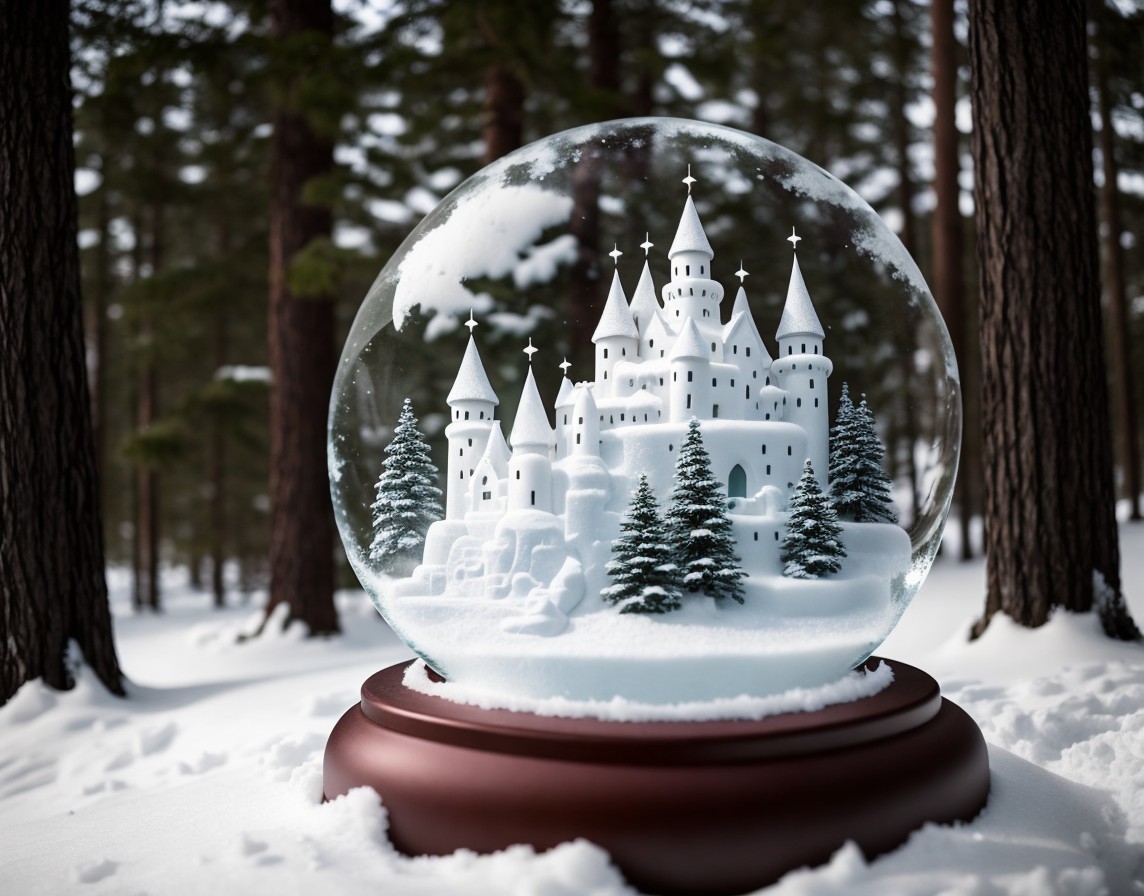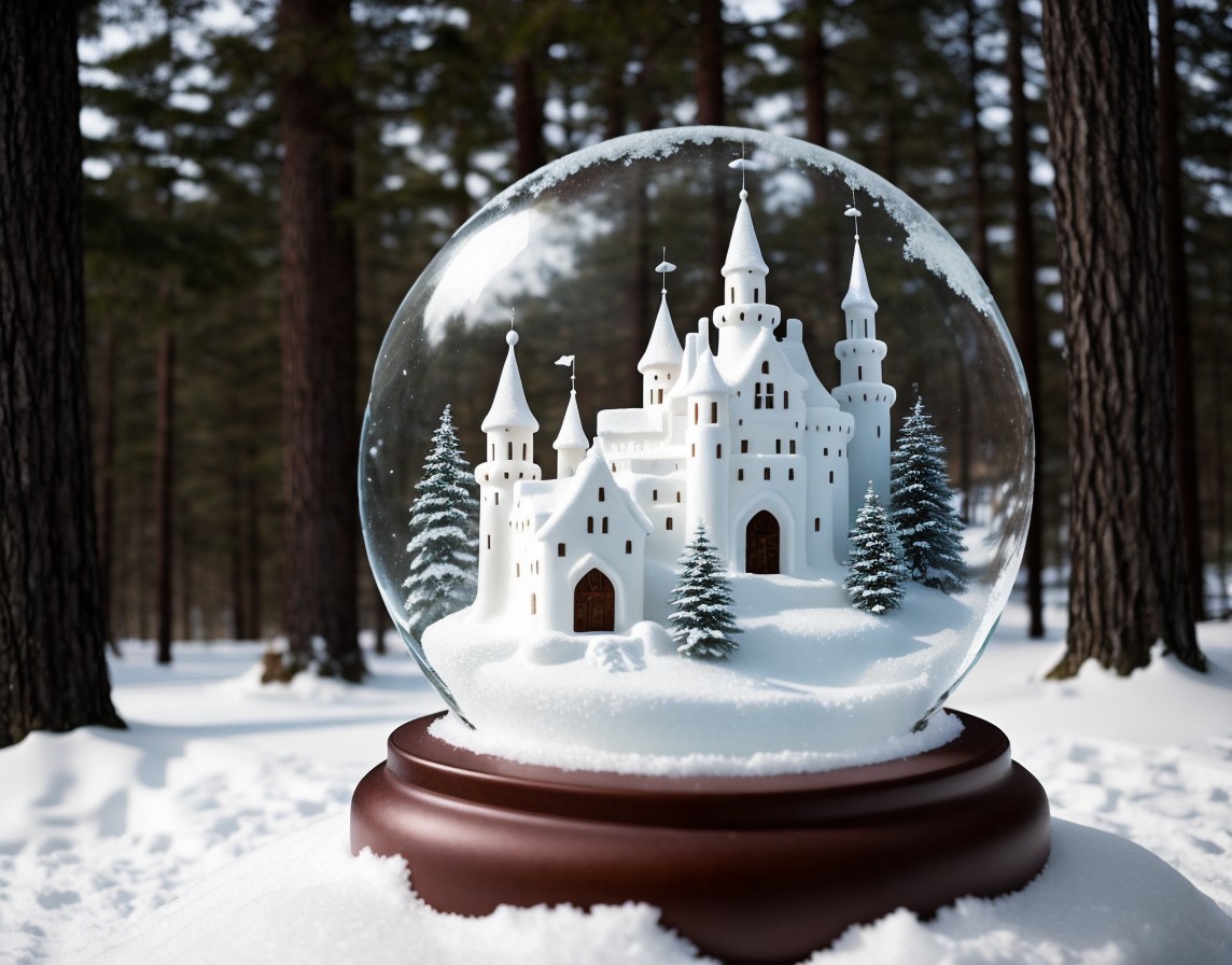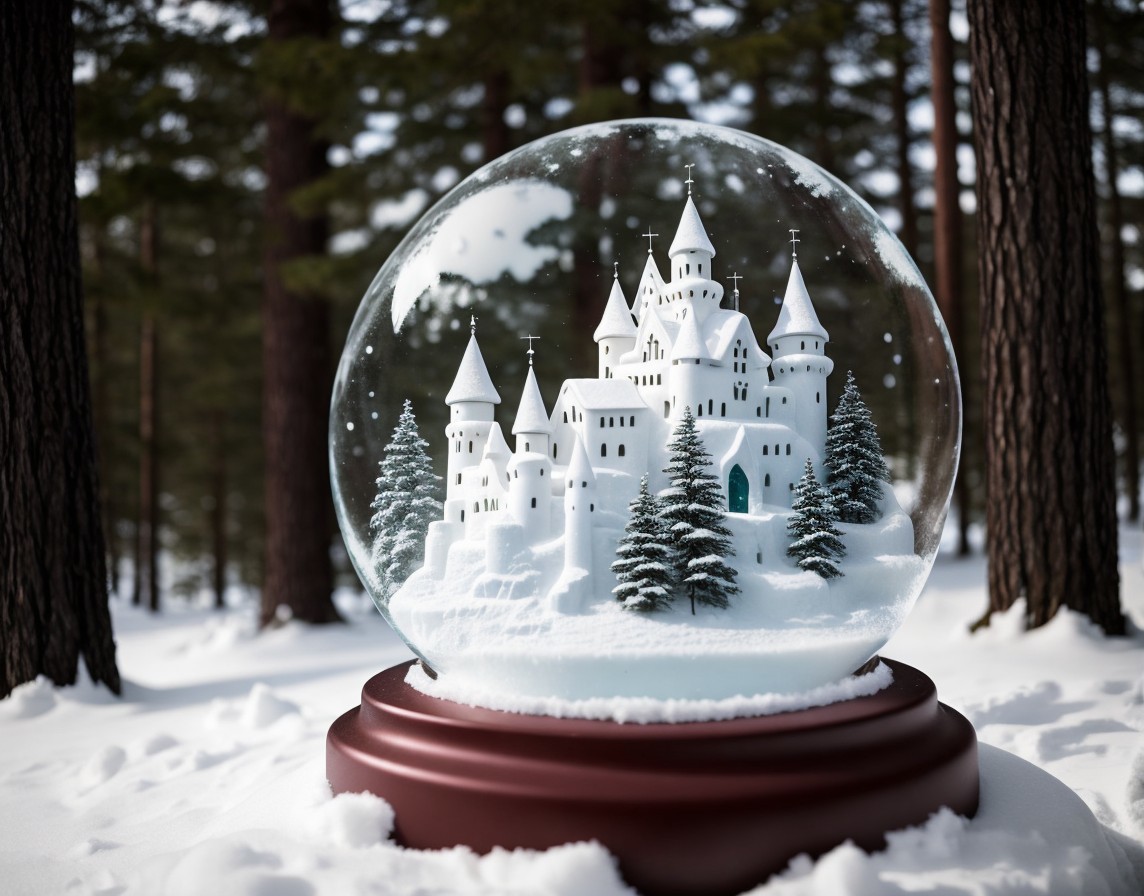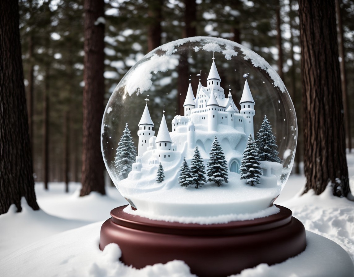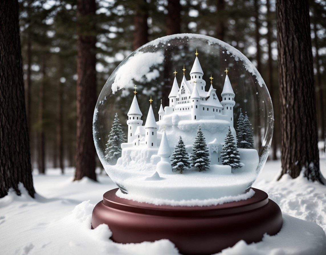A snow globe with a castle sits on snow among pine trees, snowflakes gently falling inside it.