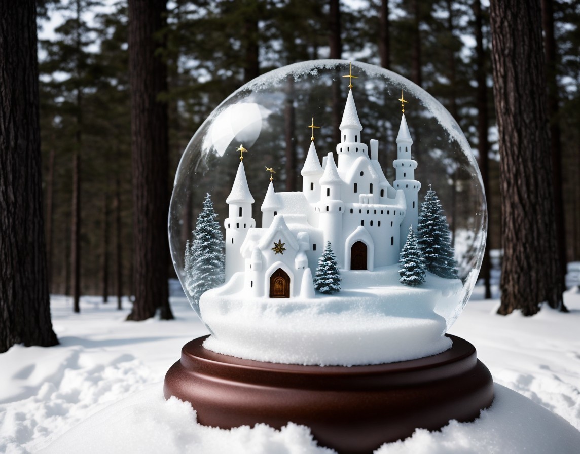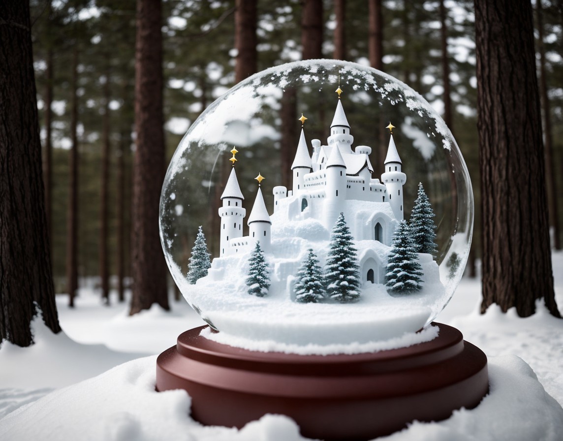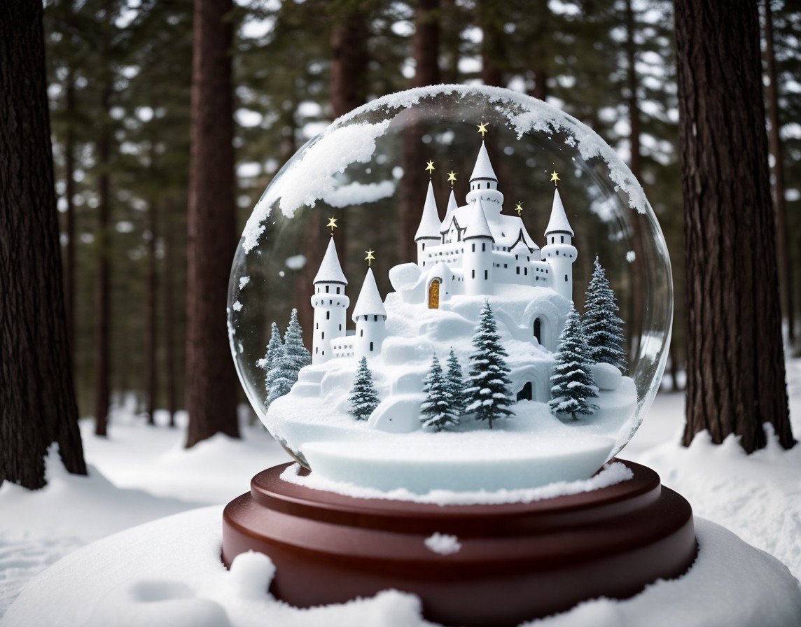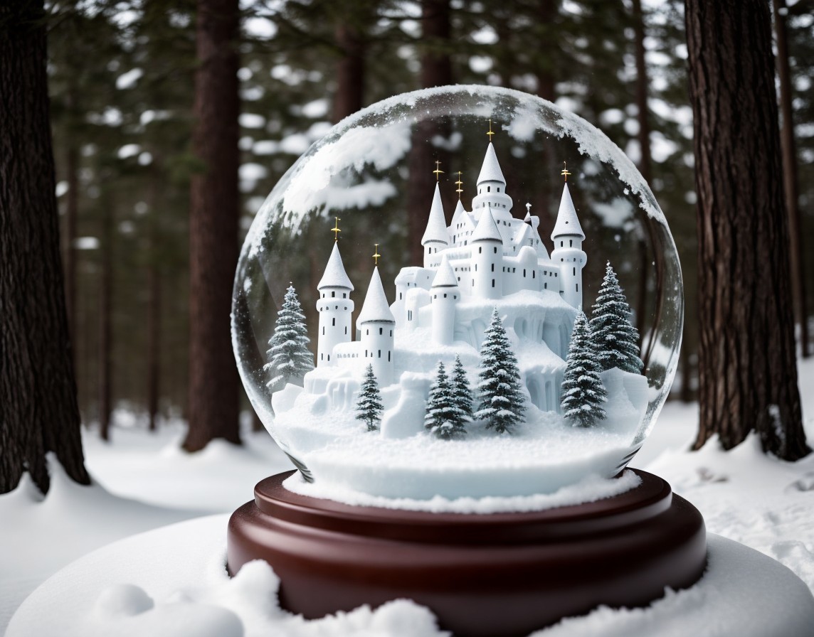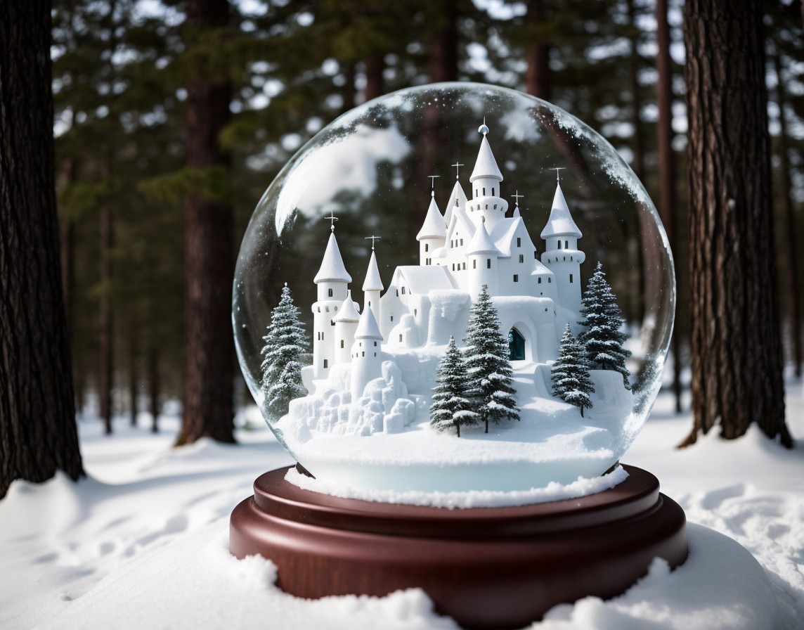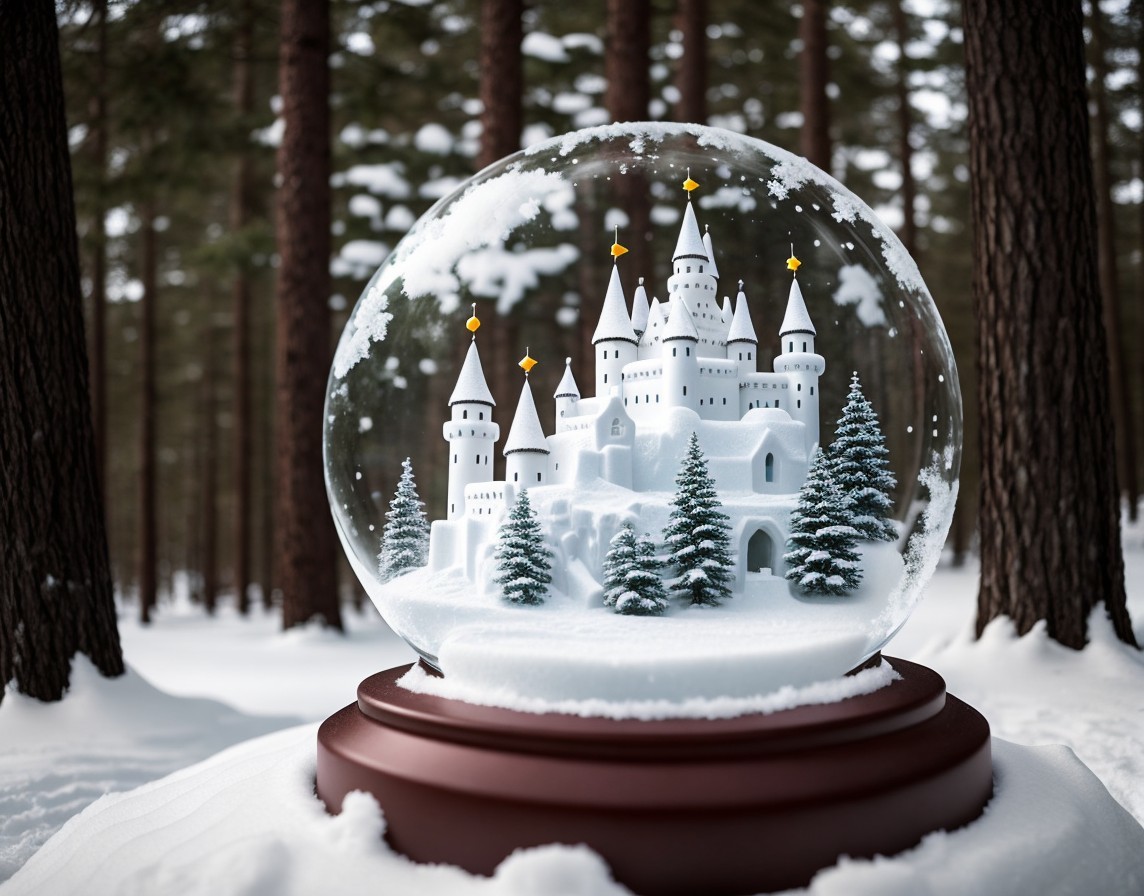 A snow globe with a castle sits on snow among pine trees, snowflakes gently falling inside it.