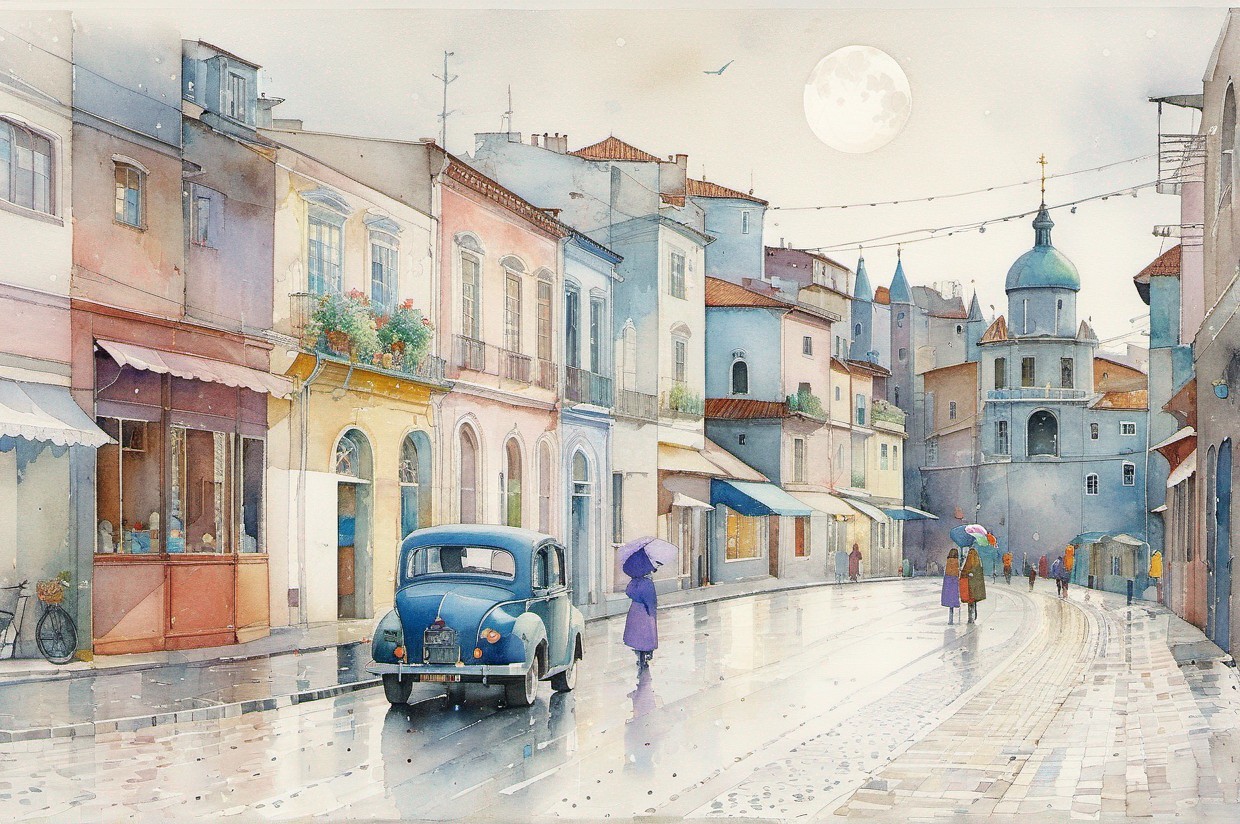 A colorful, whimsical street with vintage architecture, an old car, and people with umbrellas on a sunny, rainy day.