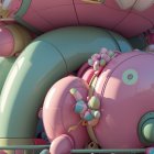 A whimsical cluster of oversized, colorful spheres and tubes in pastel pink and green shades, resembling a fantastical sci-fi structure or playful balloon installation against a clear sky.