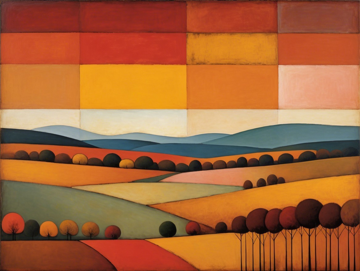 The image features a vibrant landscape, composed of bold, geometric patches in warm hues of orange, yellow, and red, with rolling hills and stylized trees creating a harmonious scene.