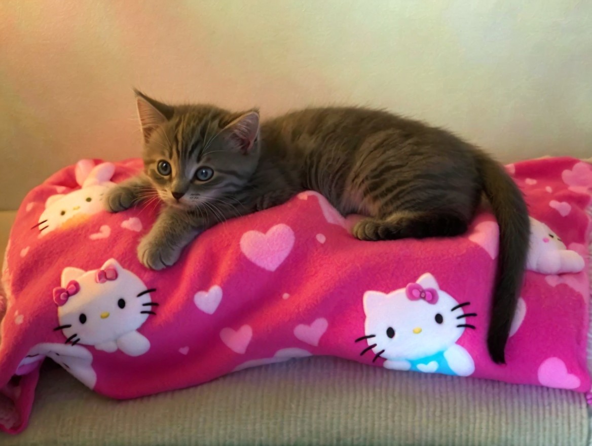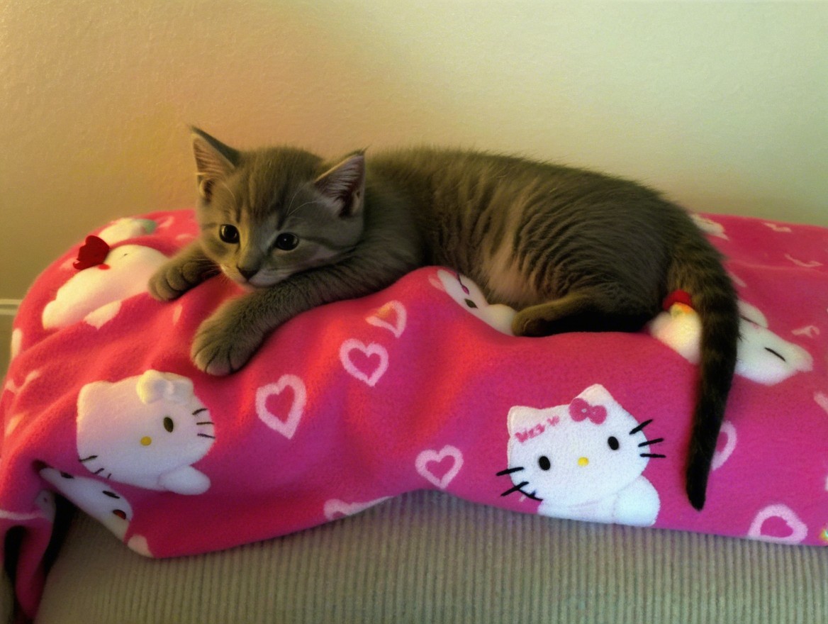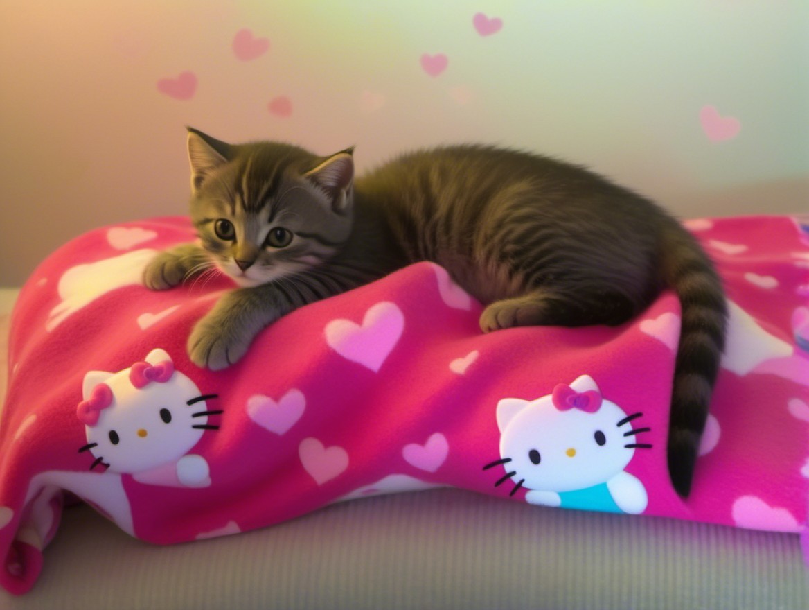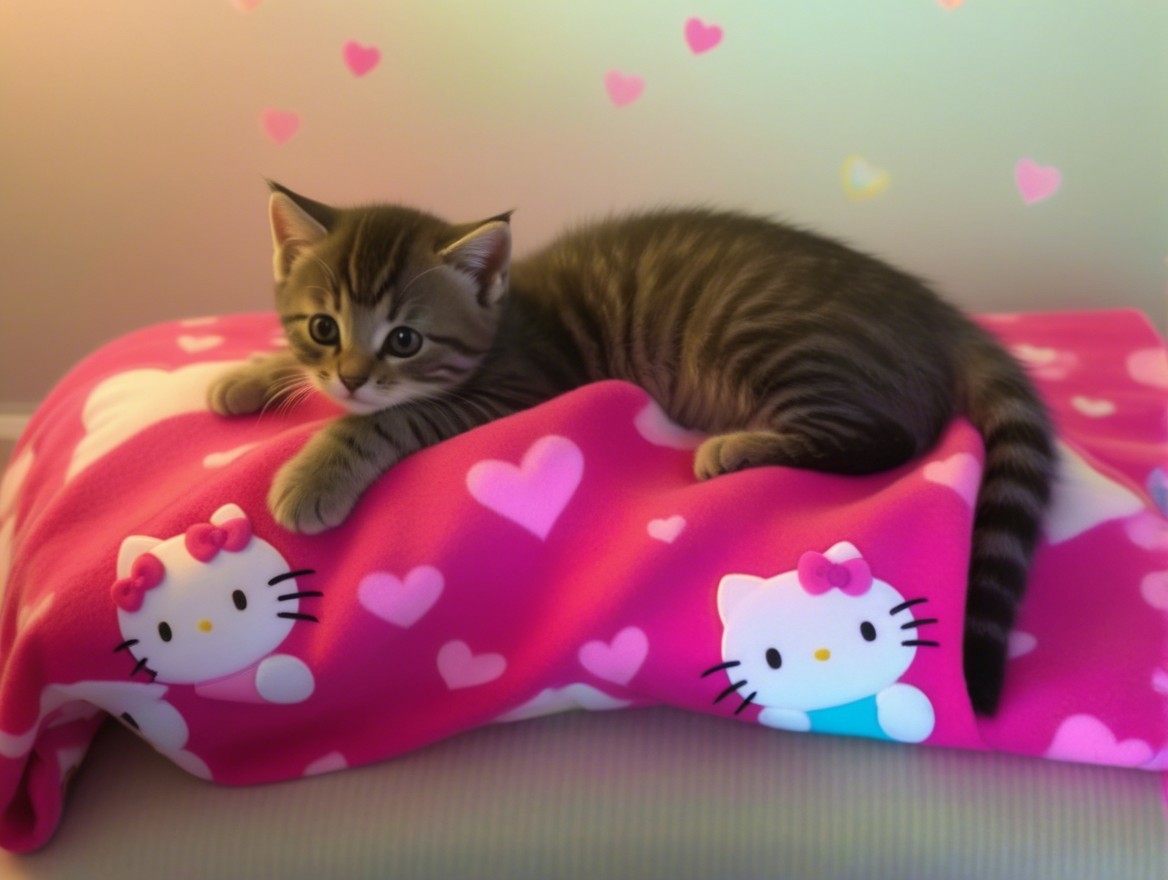 A playful striped kitten rests on a pink blanket adorned with cute Hello Kitty designs and hearts, exuding a cozy and adorable vibe in a colorful setting.