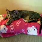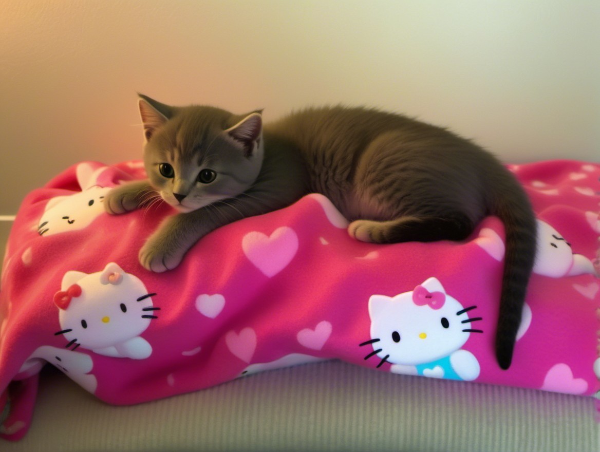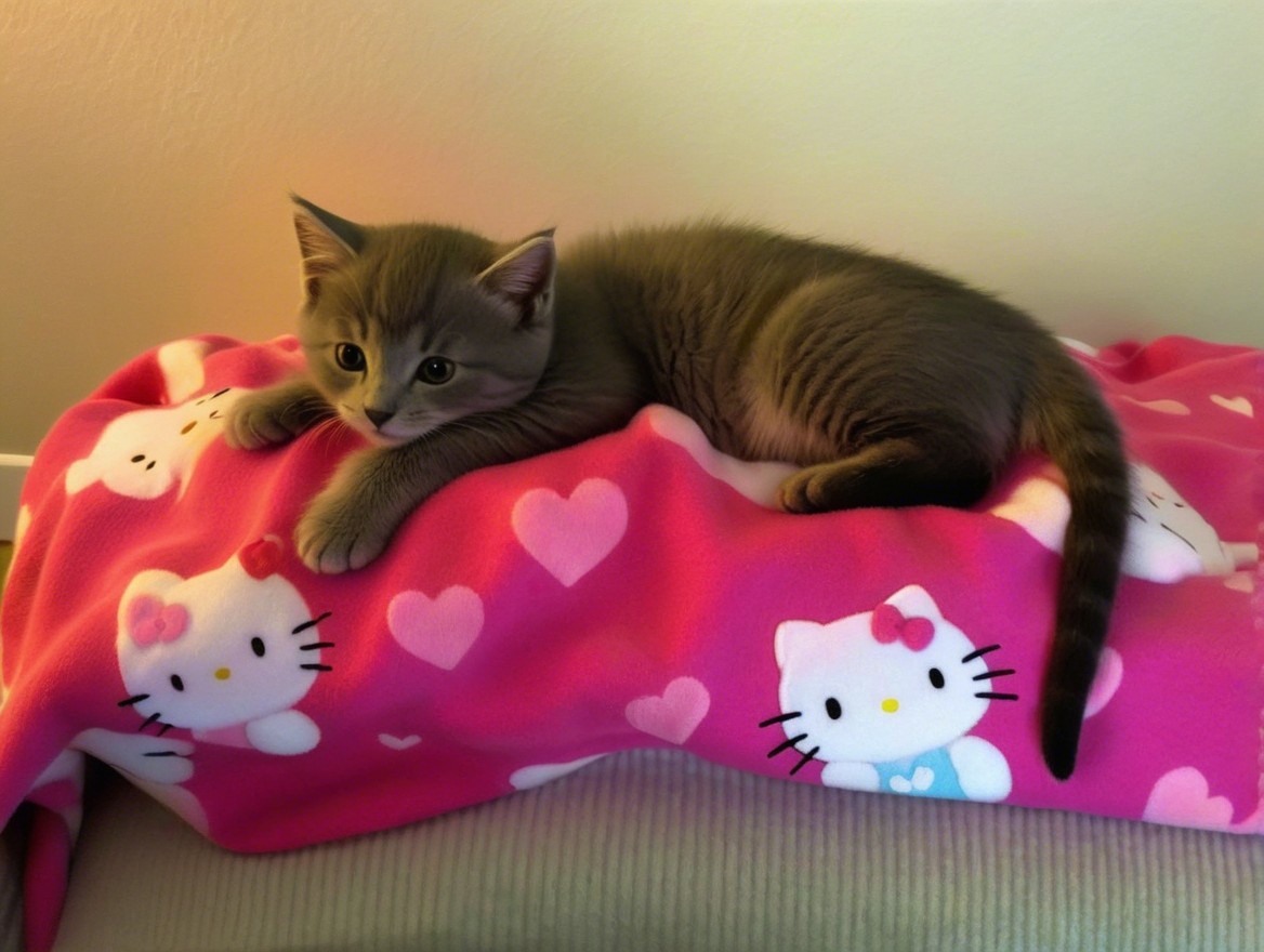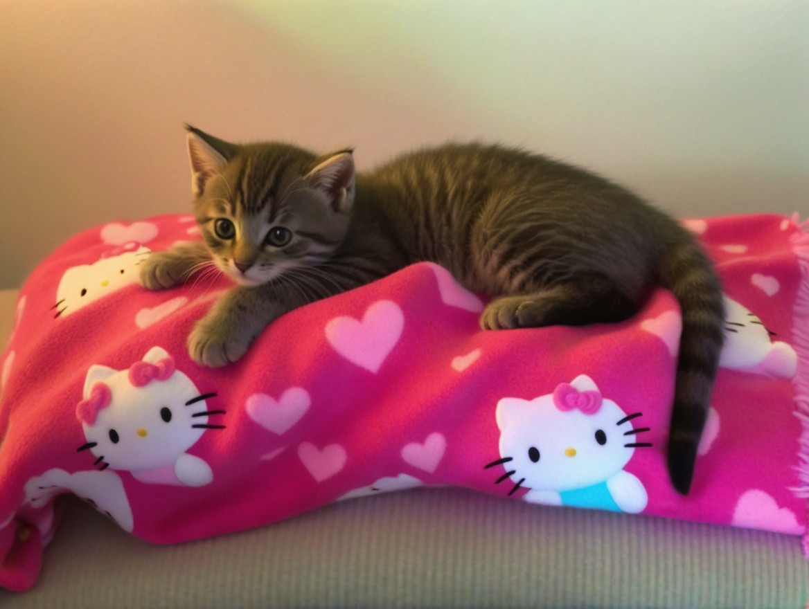 A playful striped kitten rests on a pink blanket adorned with cute Hello Kitty designs and hearts, exuding a cozy and adorable vibe in a colorful setting.
