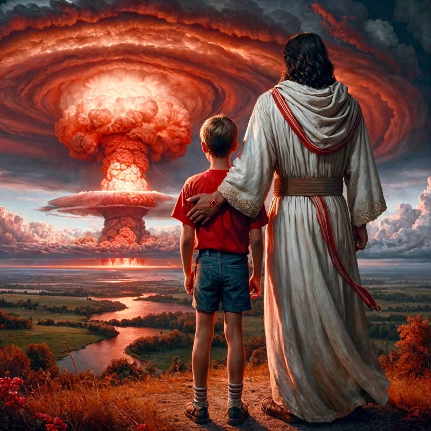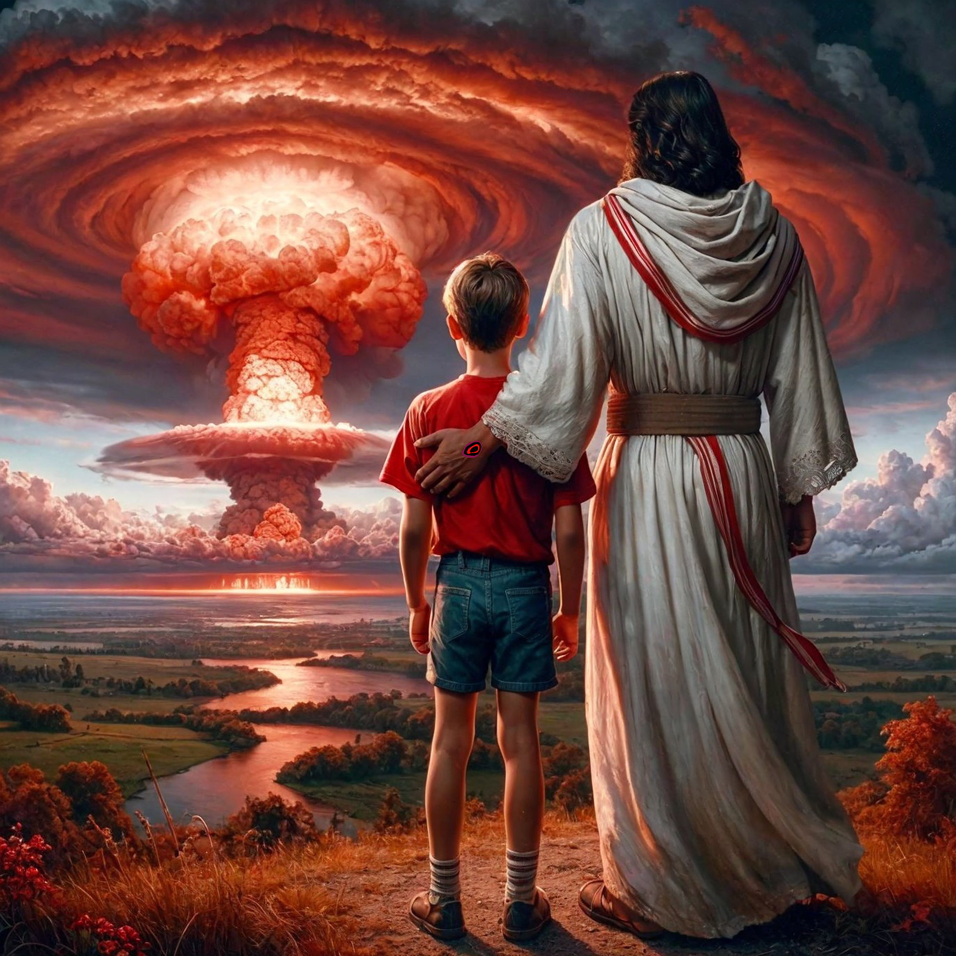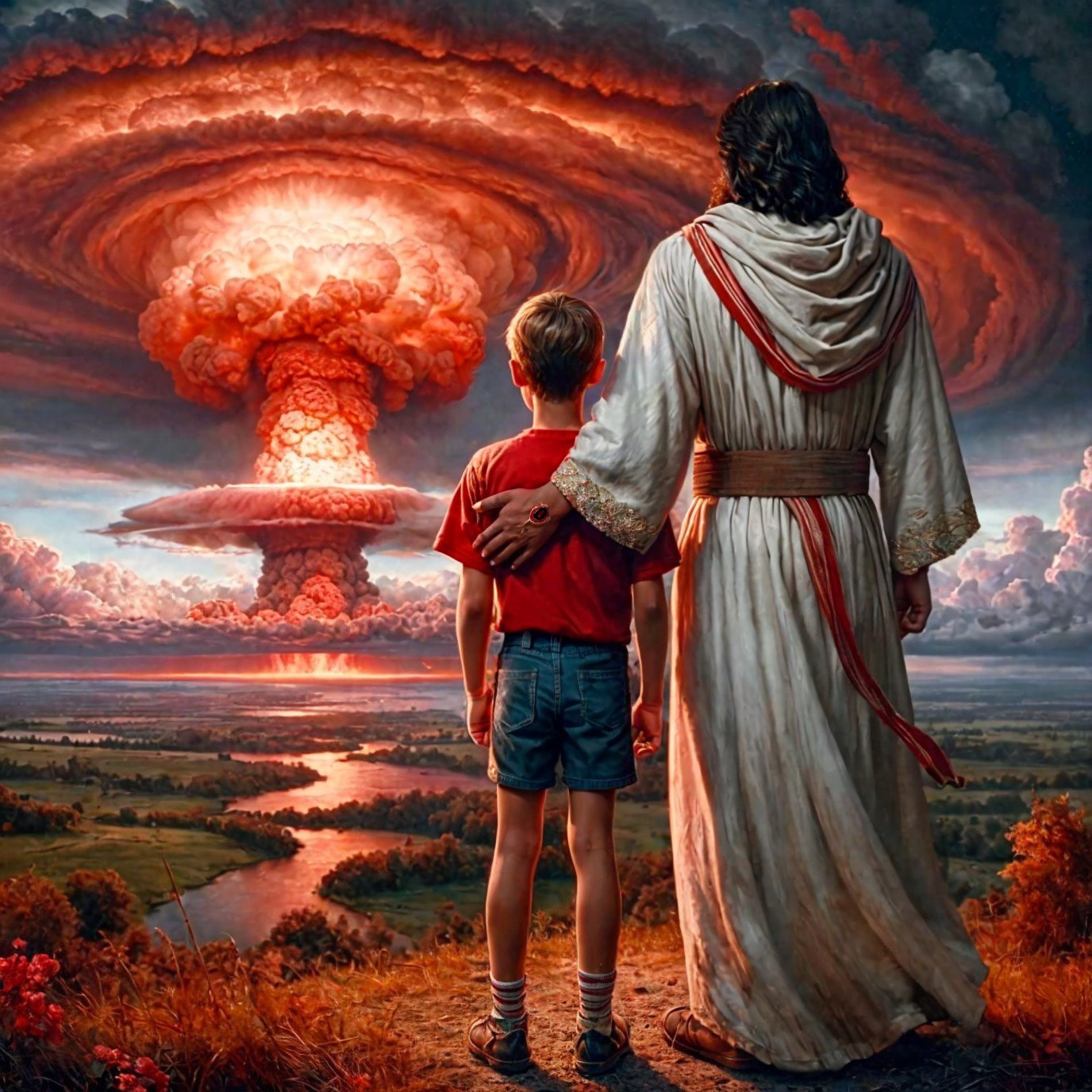 Jesus and a boy watching a terrible event together.