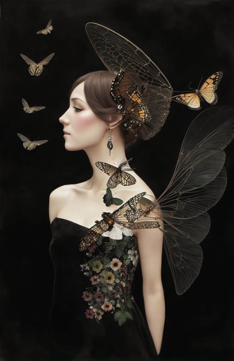 A woman with butterfly wings and a corset stands against a black background, with a metallic butterfly on her shoulder and a small one on her mouth.