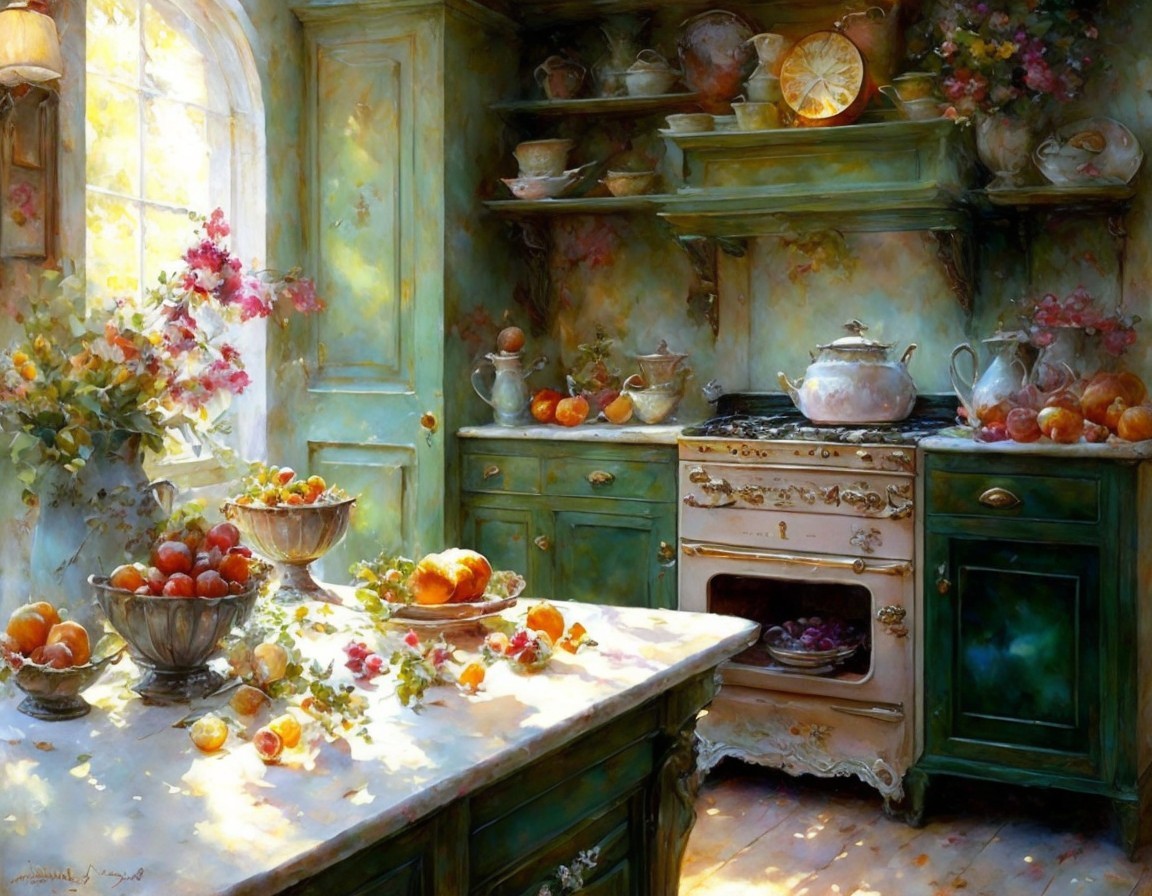 Vintage Kitchen with Cake and Floral Decor