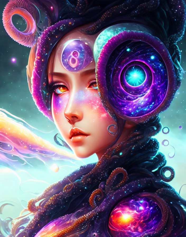 A woman with cosmic-themed attire and headgear, including an iridescent, spiral shell-like accessory, exudes a mystical aura against a celestial backdrop.