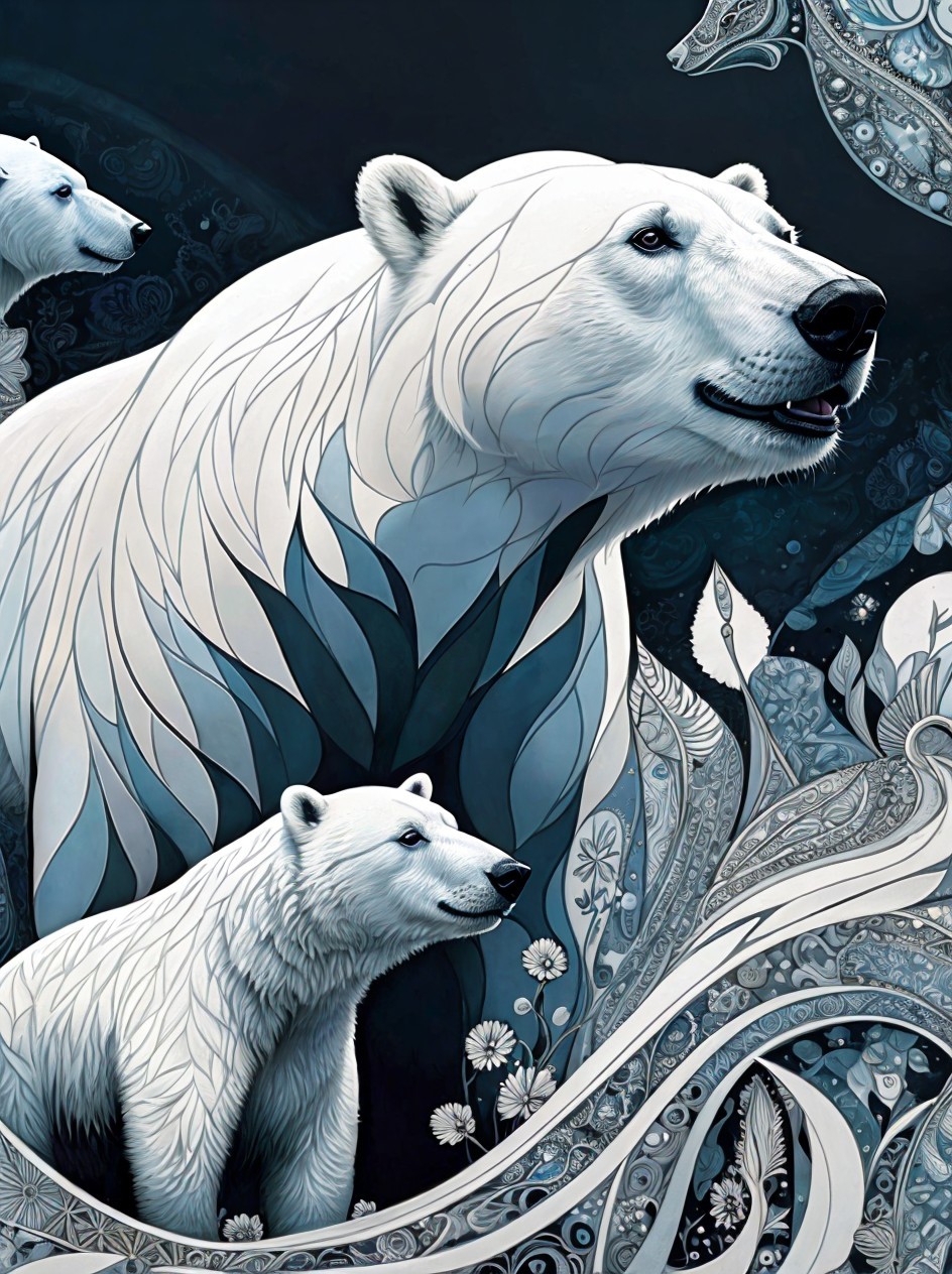 close-up image of a polar bears are very beautiful, just like this polar bear, in Zentangle and Paisley, the style of serge Najjar, David Nordahl,Matte Painting, Magic Realism, Bright colors, hyper quality, high detail, high resolution, by Roberto Ferri, , side view, dramatic, portrait, , gestural painting, gestural