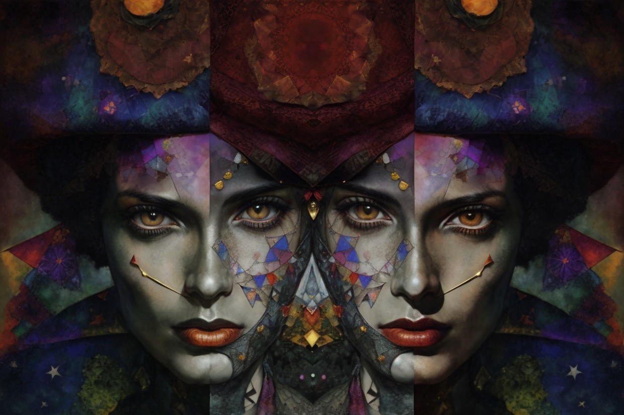 + Prompt:TWO women double exposere, witch sharing brain, huge hat, cosmic background, ethnically varied skin, demon, by Egon Schiele, Paul Klee mixed media, depth of field, metallic ink details and realistic textures created by Dave McKean and Richard Corben