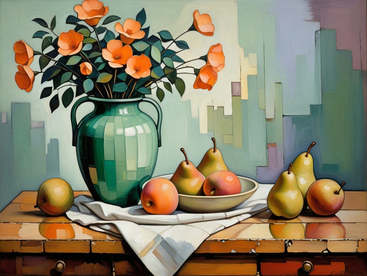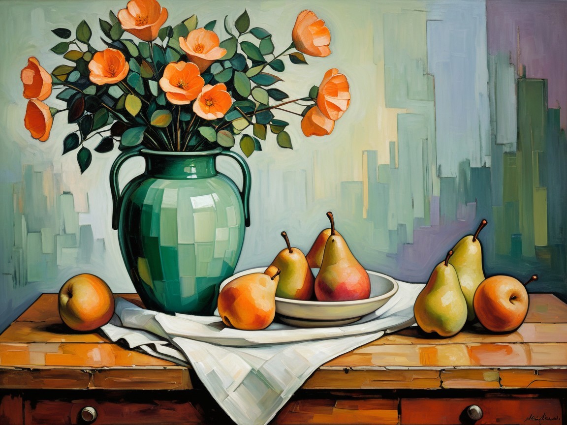 A still life featuring a green vase filled with orange and pink flowers. Nearby, a bowl holds several pears on a white cloth, all set against a colorful, abstract background.