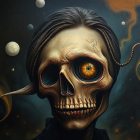A surreal portrait featuring a skull with a striking orange eye, surrounded by cosmic elements like planets and swirling colors, blending themes of mortality and the universe.