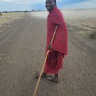 Prompt: "A smiling 7-year-old African boy standing on a dusty rural road in East Africa, dressed in a miniature red Maasai shuka, holding a small wooden stick. He is barefoot or wearing simple sandals. The background features dry grasslands with a herd of goats or sheep raising dust. The scene is set during sunset, with warm, natural lighting and a cloudy sky with hints of blue and orange, capturing a peaceful pastoral atmosphere.