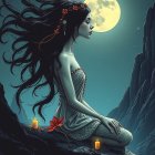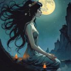 Woman with Long flying black Hair, sitting in Meditation, moonlight, Style: Möbius, Daniel Merriam, Egon Schiele, Alphonse Mucha, Anna Dittman, illustration