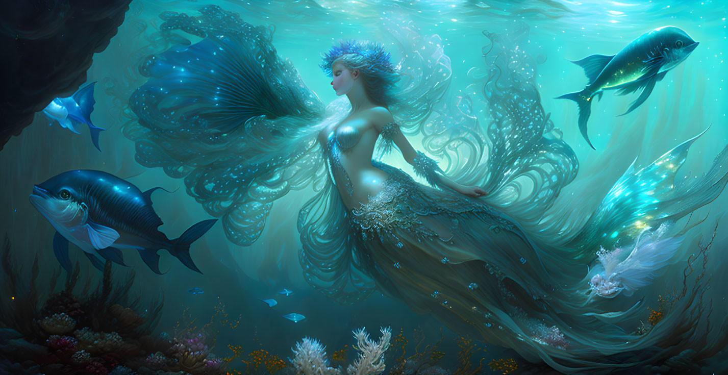 drawing, by greg rutkowski and francois boucher, of gorgeous silver mermaid on the bottom of the sea, with flying fish and jelly fish tail over a bioluminescent sea plants. oil on canvas.