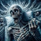 A skeletal figure with glowing blue tattoos holds a flickering light in a dark, cavernous setting. Its haunting expression and wild hair enhance the eerie atmosphere of the scene.