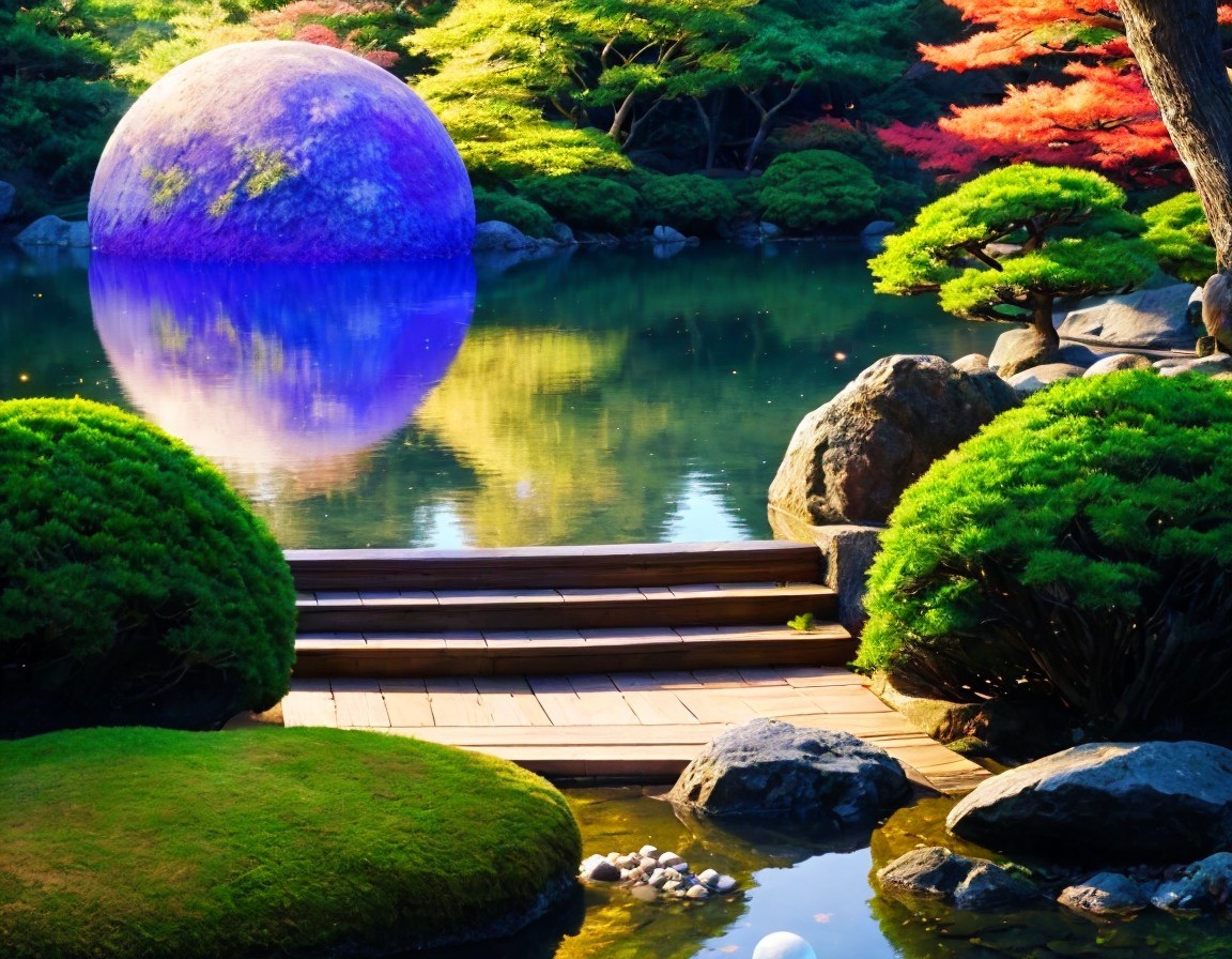 A traditional Japanese house with a large moon, surrounded by a garden with cherry blossoms and a tranquil pond at night.