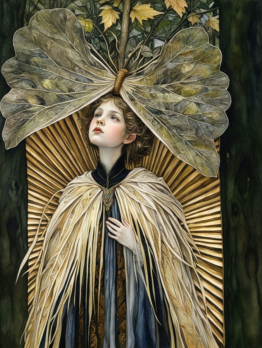 The image depicts a young girl adorned in a beautifully detailed cloak with feather-like patterns, wearing a wide-brimmed, nature-inspired hat, evoking an enchanting, mystical atmosphere in a forest setting.