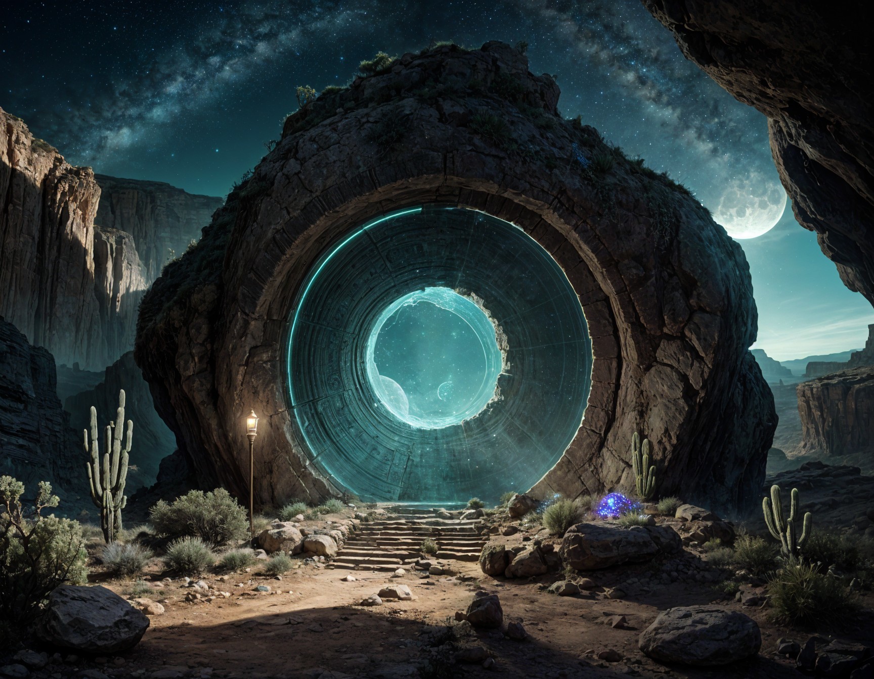 A mystical night landscape with stone arches, a meditating figure, glowing symbols, and a starry sky.