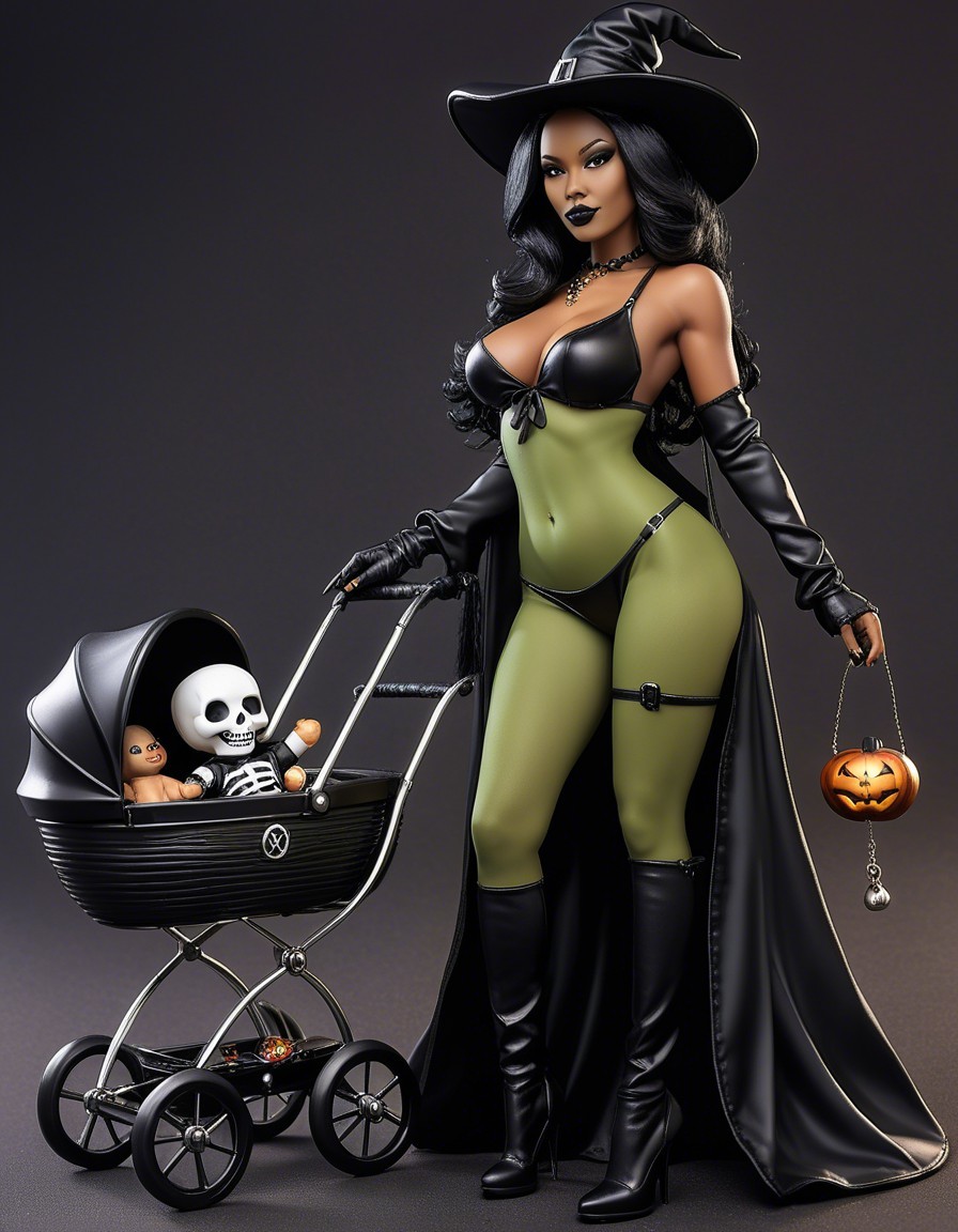 A stylish witch in a black outfit pushes a stroller featuring a skeleton and dolls. She holds a pumpkin bucket and has long dark hair, exuding a playful Halloween vibe.